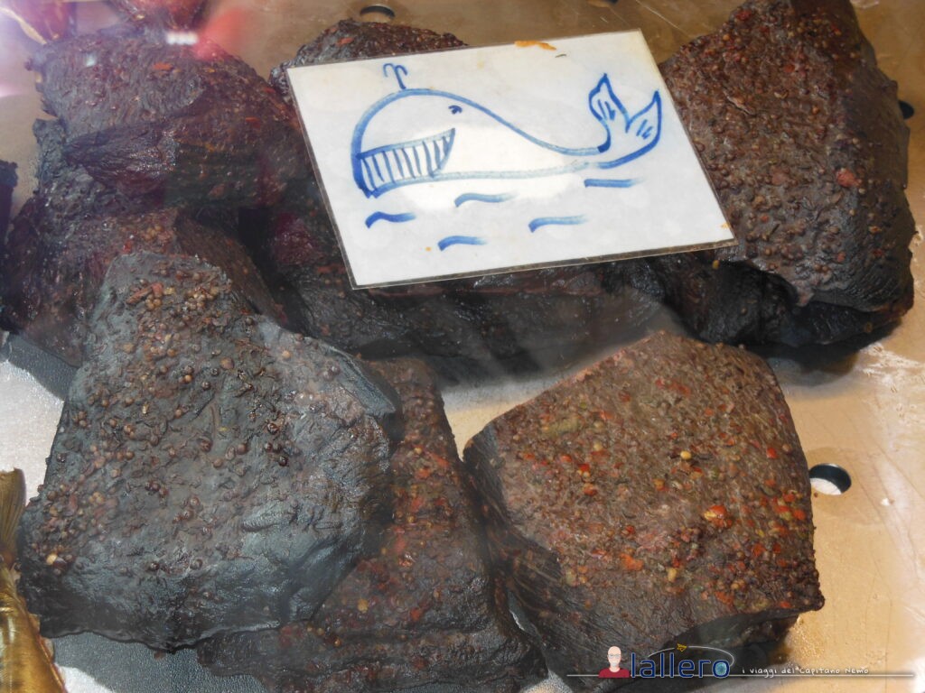 Hvalkjott: ne ho parlato diffusamente nel box del diario di viaggio, quindi non tornerò sopra alla cultura locale di mangiare la carne di balena: in filetti, bistecche, spezzatino o stufato, che sia carne, interiora (in particolare il fegato), pelle o grasso … del gigante dei mari non si butta via niente!